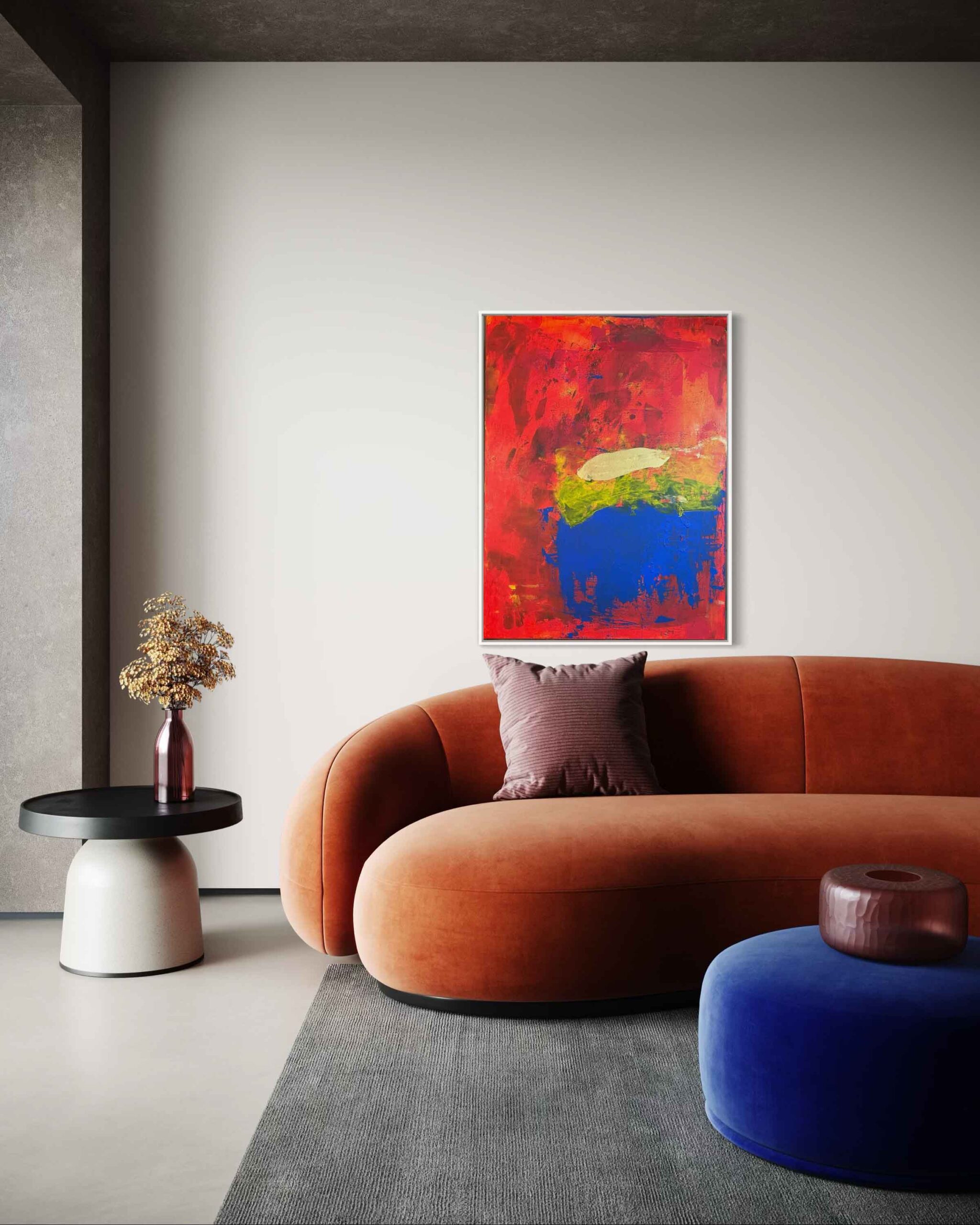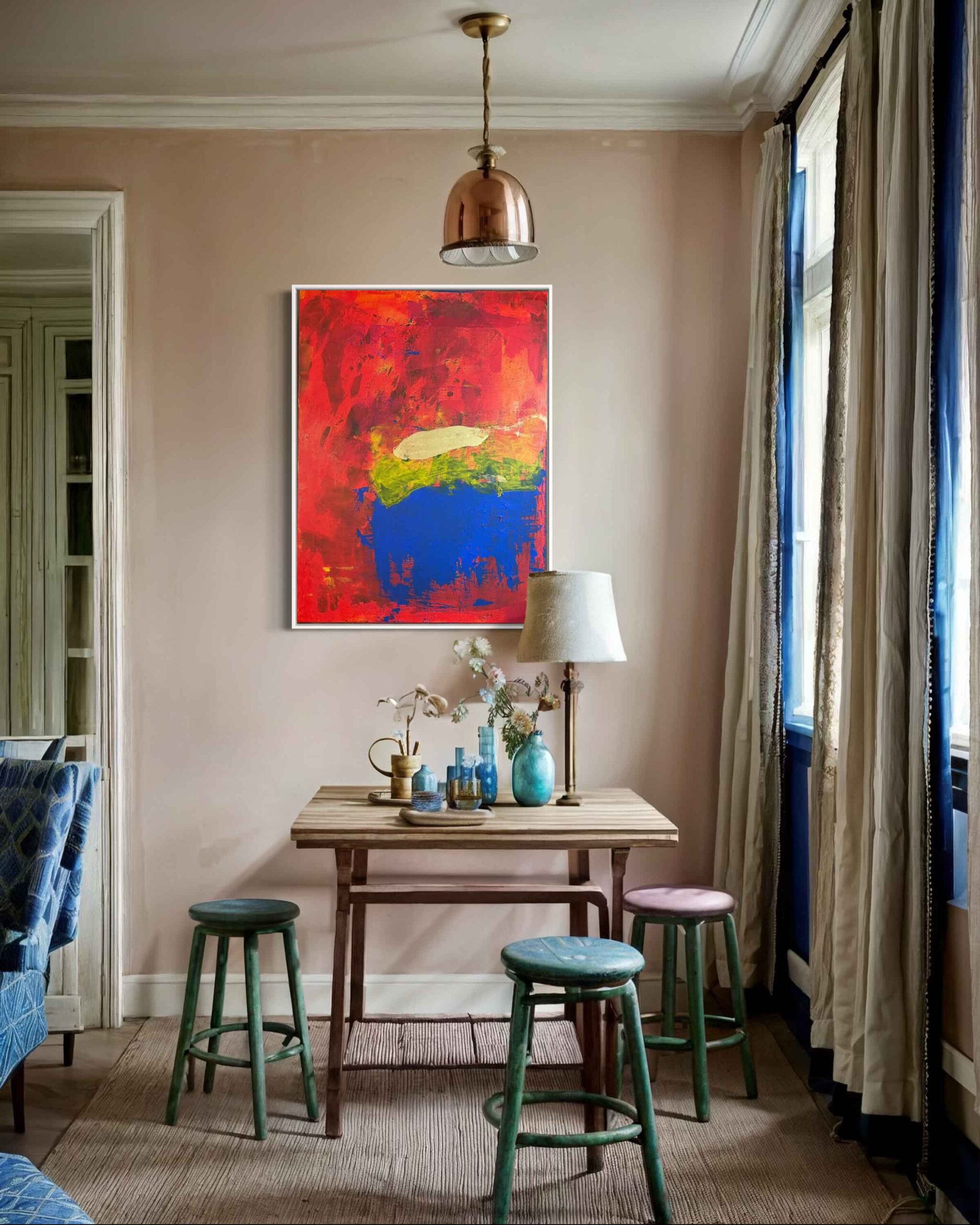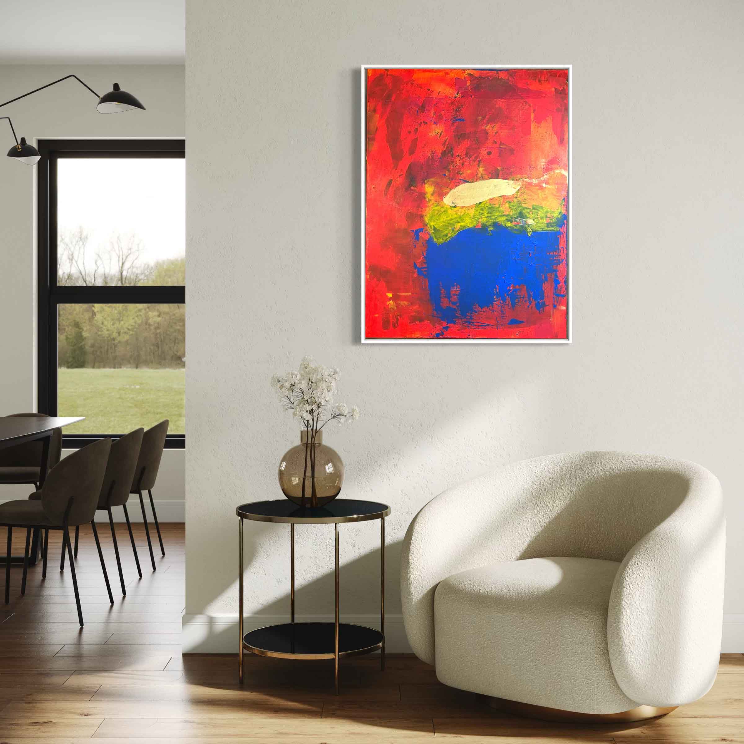 A vibrant abstract landscape inspired by the colors of autumn. Bold reds, oranges, and yellows blend with earthy greens and deep blues, creating a striking statement piece for any space.